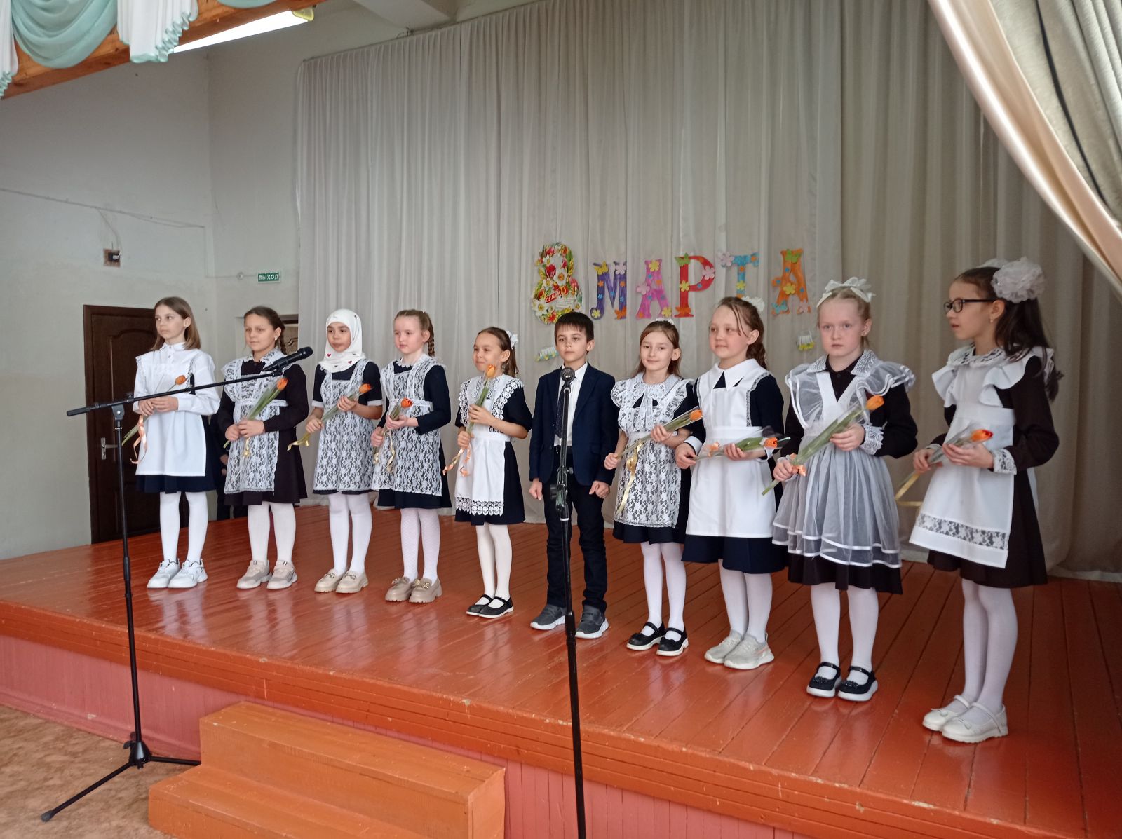 В этот день актовый зал нашей школы был наполнен атмосферой весеннего настроения, улыбками, радостью. Ведущие концерта поздравили всех присутствующих с наступающим праздником весны, любви и надежды и пожелали здоровья, благополучия, жизни радостной и светлой, как сама весна.
