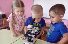 Дети средней группы на занятии по познавательному развитию познакомились с микроскопом с целью развития познавательно-исследовательского интереса.