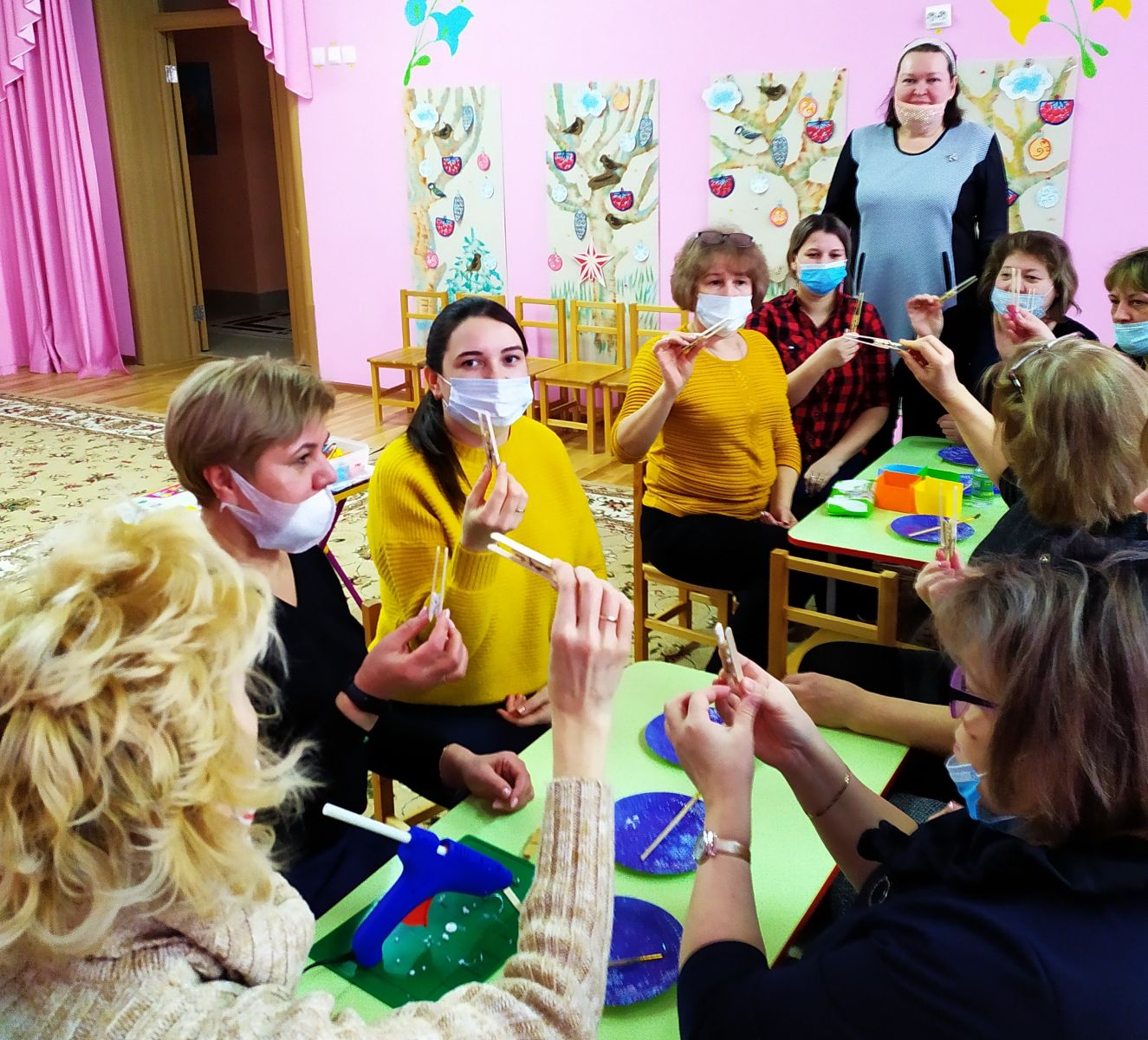 В рамках работы педагогического коллектива над годовым планом для педагогов детского сада воспитателем Тимошкиной Н.Н.была проведена консультация с элементами мастер-класса на тему " Развитие мелкой моторики у детей дошкольного возраста". Педагог подчеркнула ,что движения пальцев и кистей ребенка имеют особое ,развивающее значение . "Ум ребенка находится на кончике пальцев",говорил В.А.Сухомлинский. Для развития мелкой моторики много интересных приемов,используются разнообразные стимулирующие материалы.К ним относятся: самомассаж, различные пальчиковые игры. Наталья Николаевна провела небольшой мастер-класс по изготовлению зажимов для использования в различных играх на развитие мелкой моторики.