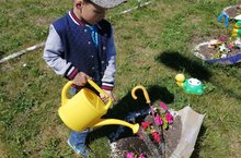 Учим видеть красоту с детства и заботиться о ней. Детям нравится заниматься цветами, с удовольствием поливают цветы на участках.