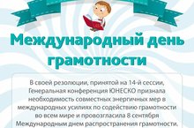Международный день грамотности, отмечаемый 8 сентября, был проведен в школе в форме устного журнала. Учащиеся 5-9 классов подготовили устное выступление на темы: «Грамотное письмо-признак культурного человека», «Язык-это путь цивилизации и культуры». Ученики 9 класса написали эссе на тему «Моя речь-это моё достоинство».