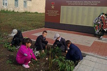 Следующим этапом было посещение обелиска участникам ВОВ и труженикам тыла. Учащиеся 3 класса вместе с классным руководителем Калимуллиной И.Н. собрали с территории опавшие листья, сорную траву, стёрли пыль с поверхности обелиска. Они ещё раз почтили память павших.