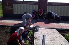 Учащиеся 7-8 класса нашей школы проводили работу пои благоустройству и озеленению территории обелиска открытого в честь 70-летия Великой Победы. -