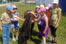 День начался с утренней зарядки, с последующей беседой о вреде пагубных привычек.«Алло, мы ищем таланты!» Так назвали мы сегодняшний день, ведь в каждом ребенке лежит талант , который взрослые должны помогать развивать и совершенствовать. Сегодня каждый воспитанник пришкольного лагеря сумел показать себя творчески. Кто-то пел, кто-то танцевал. кто –то показывал театрализованное представление.А самое интересное- мы с ребятами сходили проведать настоящего пони по кличке Дюшес к нашему односельчанину . Дети остались довольны. -
