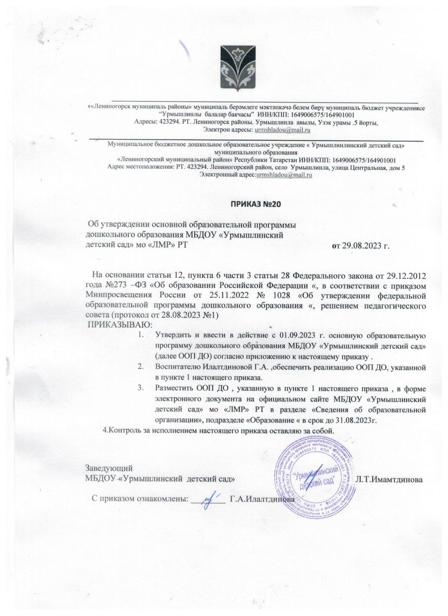 муниципальное бюджетное дошкольное образовательное учреждения «Урмышлинский детский сад " муниципального образования"Лениногорский муниципальный район" Республики Татарстан