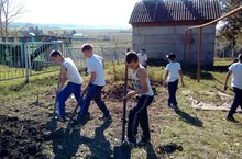 Бакчада көзге эшләр гөрли. Укучылар мәктәп яны бакчасында тырышып эшиләр: чүп җыештыралар, яшелчәәрне алалар, түтәлләрне казыйлар.