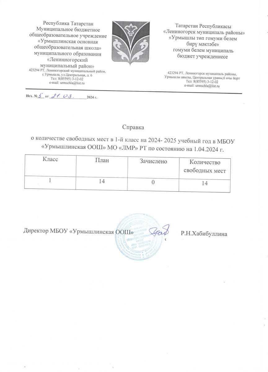 Планируемый контингент учащихся первых классов МБОУ "Урмышлинская ООШ" на 2024-2025 учебный год