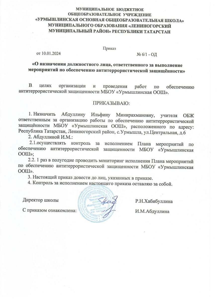 Приказ о назначении должностного лица по обеспечению антитеррористической защищенности