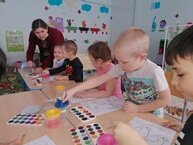 Балалар рәсем шөгылендә "Безнең белән кышлаучы кошлар" темасына рәсем ясыйлар.