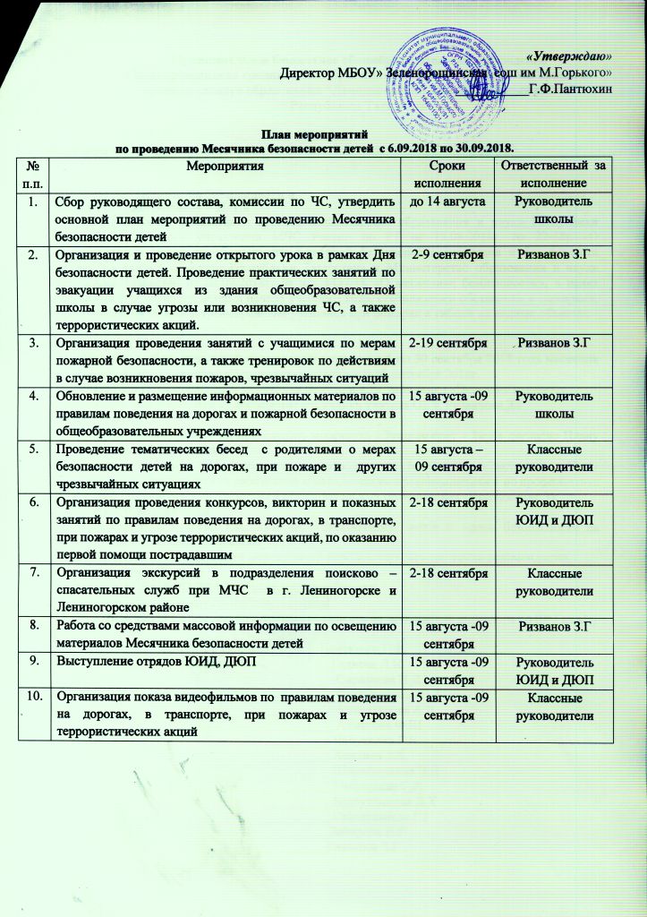 На основании приказа МБОУ "Зеленорощинская СОШ им. Горького" МО "ЛМР" РТ от 6.09.2018г. "О проведении месячника безопасности декадника "Экстремизму -- Нет!" в период с 6 по 30 сентября 2018 г в школе проводится месячник безопасности и декадник "Экстремизму -- Нет!" с 6-12 сентября 2018 г. План ЗДЕСЬ