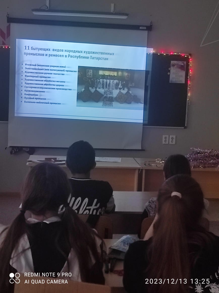 Опубликовано: 13.12.2023В рамках года национальных культур и традиций в 7-8 классах прошел классный час «Народные художественные промыслы и декоративно-прикладное искусство Республики Татарстан»