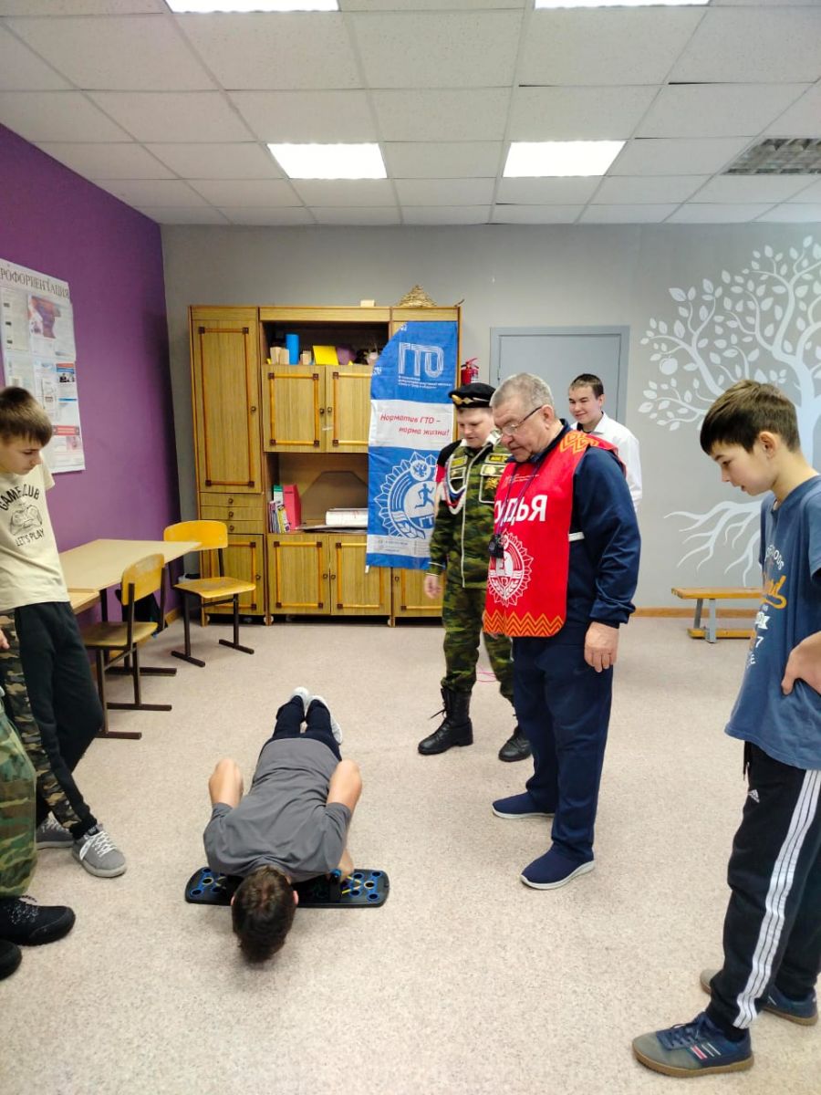 На этапе «Спортивная эстафета с элементами ГТО» ребята выполняли нормативы ВФСК ГТО по прыжкам в длину с места, сгибанию и разгибанию рук в упоре от площадки, наклону стоя на скамейке.
