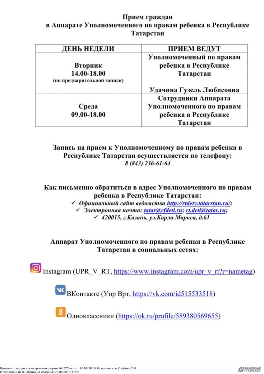 интернет-приемная: rtdety.tatarstan.ru.График личного приема граждан Уполномоченным по правам ребенка в Республике Татарстан: