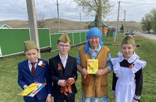 Бөек Җиңүгә багышланган "Георгиев лентасы" акциясендә укучылар мәктәп яныннан узып баручыларга Георгиев лентасы ,кулдан ясалган открыткаларны тараттылар. Һәр узып китүчеләр туктап үз рәхмәтләрен җиткерделәр.Монда узып баручылар арасында сугыш елы балалары да ,митингка килүчеләр дә бар иде. Барыбызга да тыныч аяз күкләр телибез.