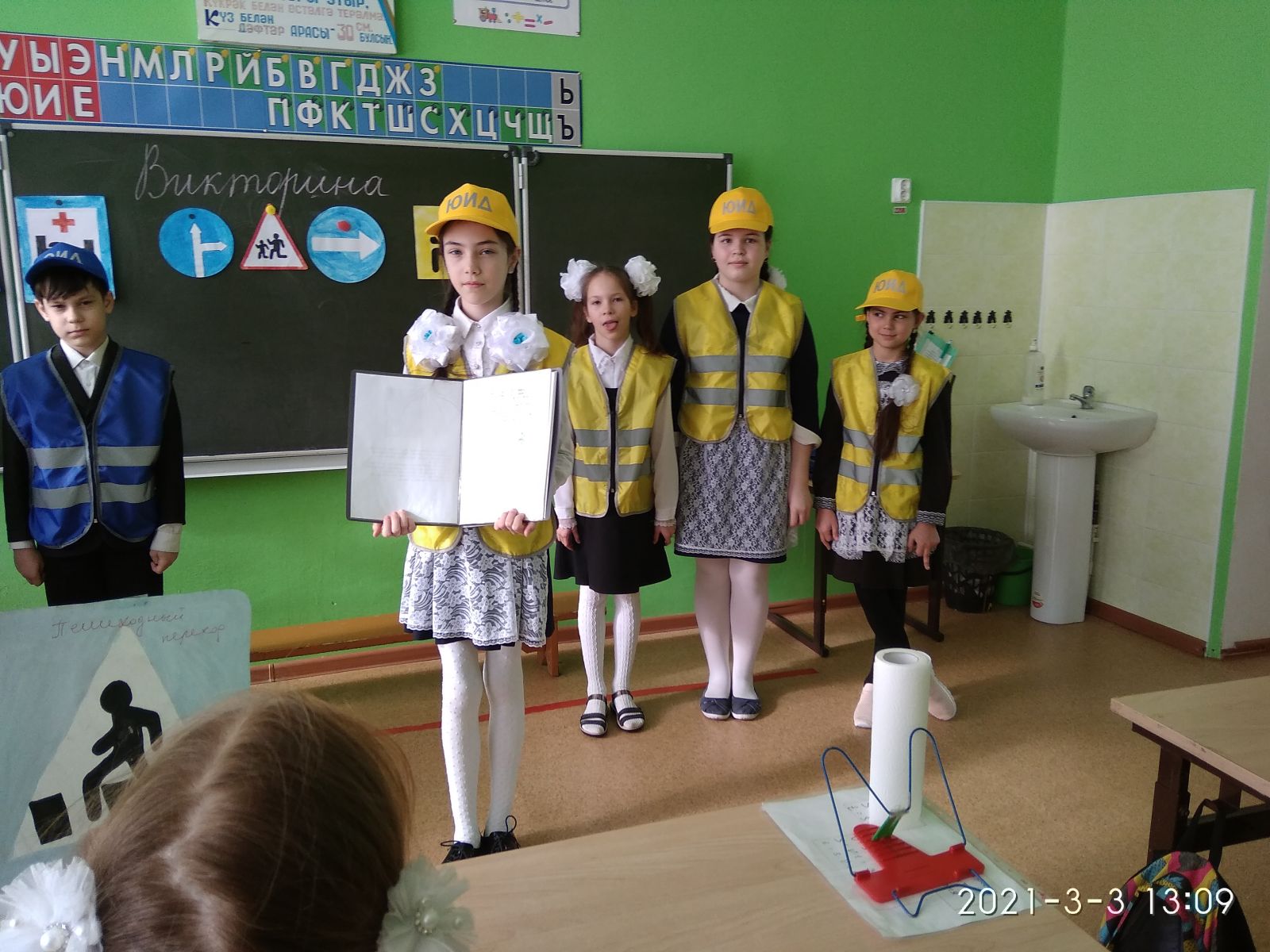 Башлангыч сыйныфлар арасында юл йөрү кагыйдәләре буенча викторина үткәрелде.“ Яшь юл йоруче инспекторлары “башлангыч сыйныфлар белән һәрдаим очрашып торалар.Алар 1-2-3 сыйныфлар арасында уен – викторина оештырдылар.Иң элек балалар белән юл йөрү тарихын искә төшерделәр.1 конкурс – “Юл чаты табышмаклары.” дип аталды.2 конкурс – “Автомульти “. Укучылардан әкиятләрдә һәм мультфильмнардагы очраган транспорт чараларын искә төшереп, җаваплар эзләделәр.3 конкурс – “Аңла мине” дип аталды..Укучылар юл билгеләренә кагылышлы сүзләрне атадылар.4 конкурс “Сөйләшә торган билгеләр!” дип аталды. Укучылар дөрес җавапны юл билгеләре арасыннан табарга тиеш булалар.5 конкурс “Конкурс викторина” дип атала.Укучылар викторина сорауларына җаваплар эзләделәр.Табышмакларга,кызыклы сорауларга җаваплар эзләделәр, шигырьләр тыңладылар.Соңыннан ЮИД командасы нәтиҗә ясады. Кайбер укучылар актив булулары белән аерылып тордылар,ә кечкенәләргә тагы да ныграк юл билгеләрен ойрәнергә,юлларда сак,игътибарлы булырга кирәк икәнне искә тошерделәрМолодцы ! Уңышлар !