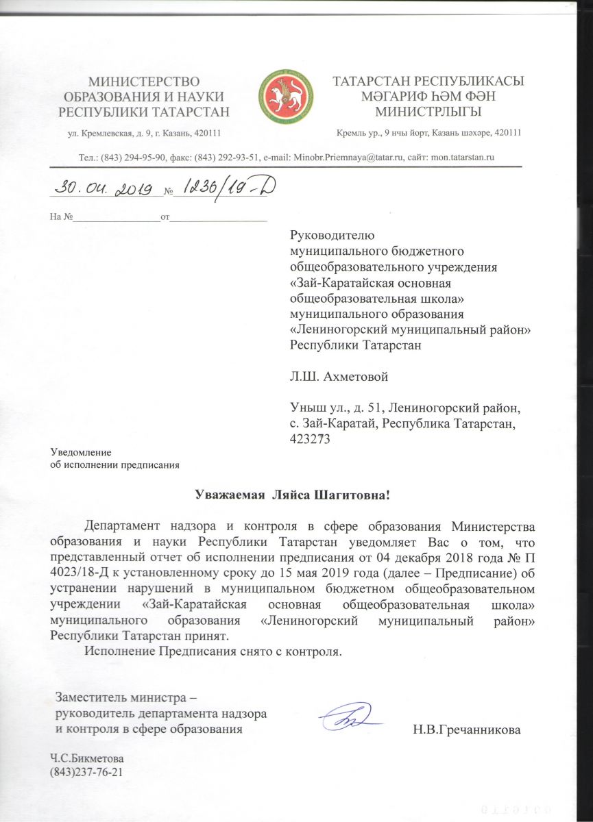 6. Уведомление об исполнении предписания от 30.04.2019г. №1236/19-Д
