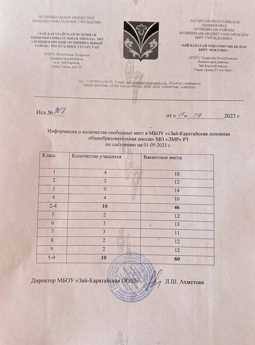 Муниципальное бюджетное общеобразовательное учреждение «Зай-Каратайская основная общеобразовательная школа» муниципального образования «Лениногорский муниципальный район» Республики Татарстан