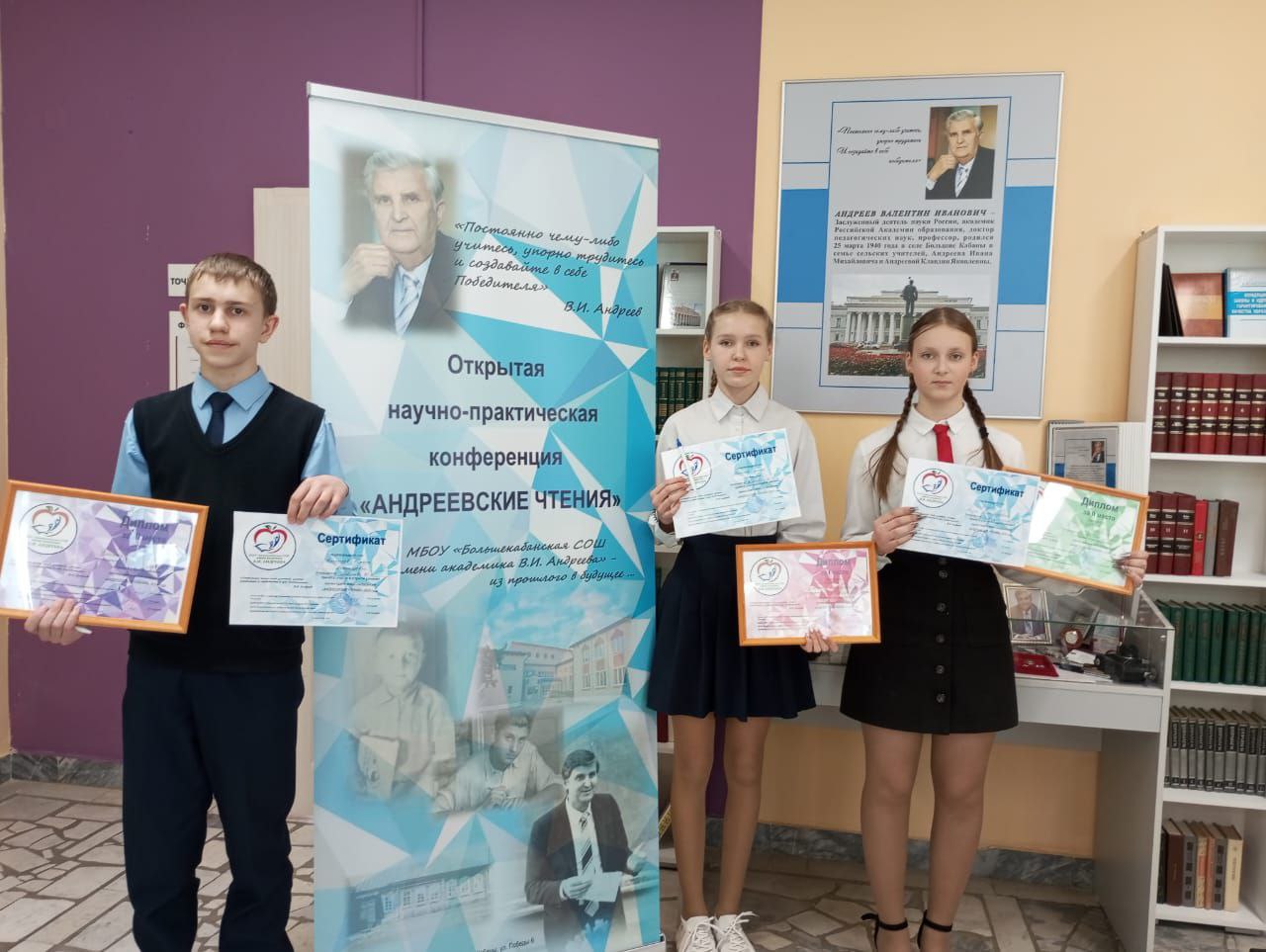 22 марта учащиеся школы приняли участие в районной НПК "Андреевские чтения". Хасанова Эмилия 1 место, Козлова Юлия 2 место, Никоноров Никита 3 место.