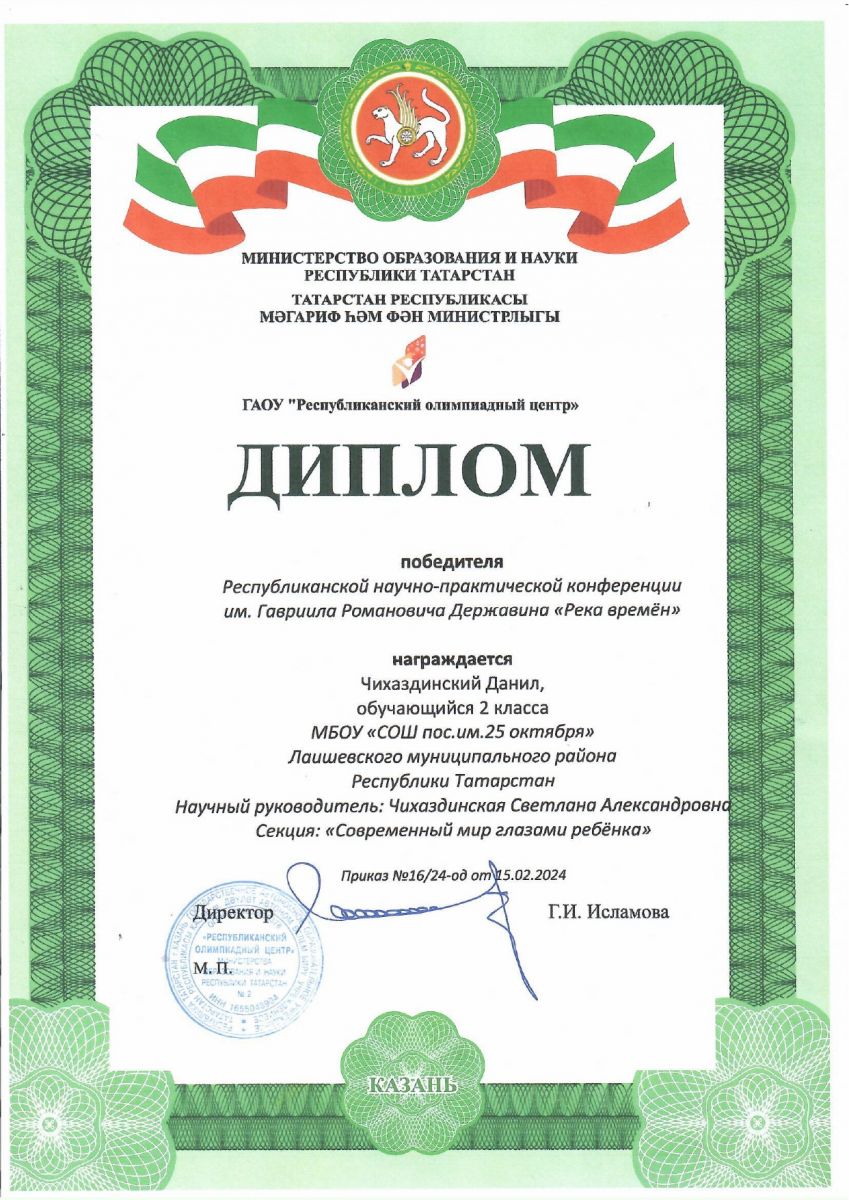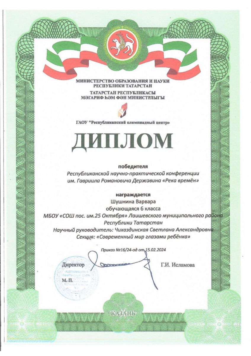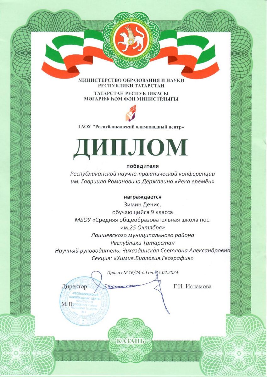 Учащиеся нашей школы Зимин Денис, Чихаздинский Данил, Шушнина Варвара приняли активное участие и стали победителями Республиканской научно-практической конференции им. Гавриила Романовича Державина "Река времен" . Научный руководитель учитель химии и биологии, педагог центра "Точка Роста" Чихаздинская С. А. ФОТО ФОТО ФОТО