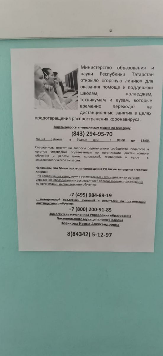 Задать вопросы можно по телефону +7(843)294-95-70 в будние дни с 9.00 до 18.00. Специалисты ответят на вопросы родителей, педагогов и органов управления образования по организации дистанционного обучения и работы школ, колледжей, техникумов и вузов в эпидемиологической ситуации, сообщает пресс-служба Министерства образования и науки РТ.