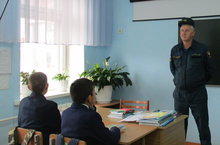 В школе прошел открытый урок по ОБЖ. Учитель ОБЖ рассказал о мерах предосторожности при чрезвычайных ситуациях, затем учащиеся старших классов продемонстрировали как пользоваться противогазами.