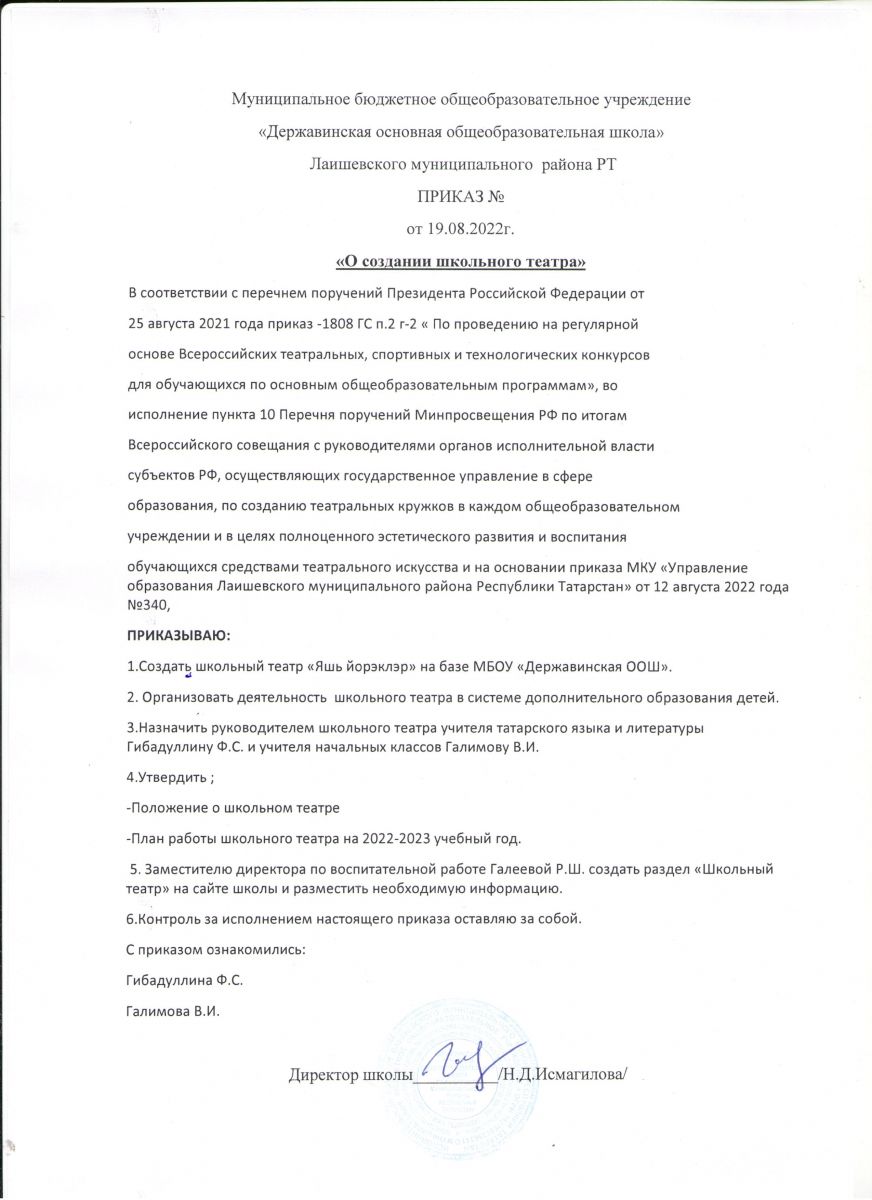 В соответствии с перечнем поручений Президента Российской Федерации от 25 августа 2021 года приказ -1808 ГС п.2 г-2 «По проведению на регулярной основе Всероссийских театральных, спортивных и технологических конкурсов для обучающихся по основным общеобразовательным программам», во исполнение пункта 10 Перечня поручений Минпросвещения РФ по итогам Всероссийского совещания с руководителями органов исполнительной власти субъектов РФ. осуществляющих государственное управление в сфере образования, по созданию театральных кружков в каждом общеобразовательном учреждении и в целях полноценного эстетического развития и воспитания обучающихся средствами театрального искусства, на основании приказа №340 МКУ «Управление образования Лаишевского муниципального района Республики Татарстан» от 12.08.2022, приказа №57-01 МБОУ «Державинская ООШ» от 19.08.2022, создано объединение дополнительного образования «Яшь йөрәкләр».