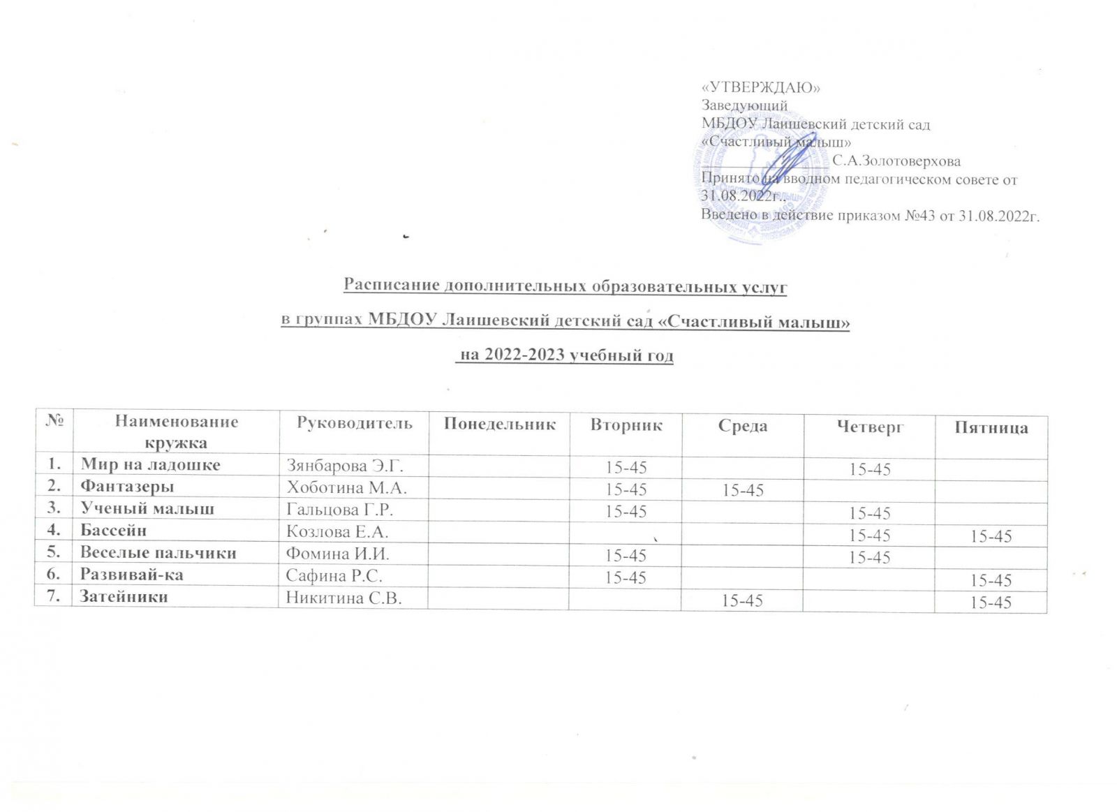 Расписание дополнительных услуг на 2022-2023 учебный год
