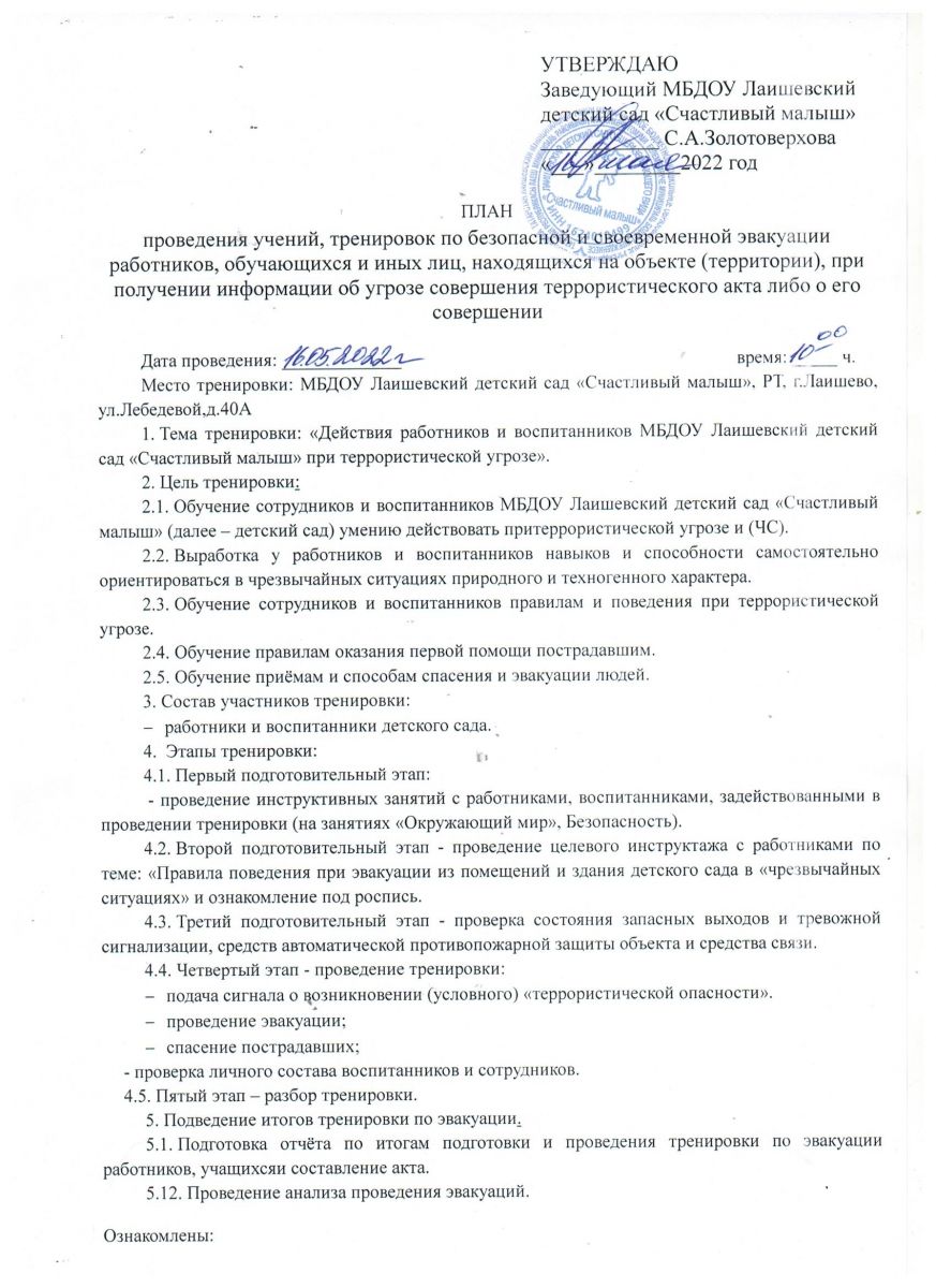 План проведения учений, тренировок по безопасности и своевременной эвакуации