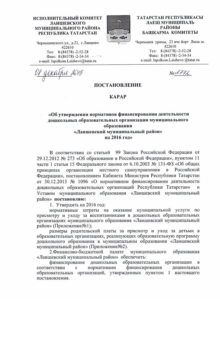 - Постановление Исполнительного комитета Лаишевского муниципального района РТ "Об утверждении нормативов финансирования на 2016 год"