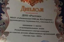 ДОО "РОСТОК" МБОУ "Габишевская СОШ им. М.А.Гареева" заняла 1 место в муниципальном этапе Республиканского смотра-конкурса для советов детских общественных организаций "Актив года - 2022". Поздравляем! Желаем дальнейших успехов!
