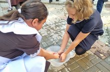 В акции приняли участие учащиеся и педагоги гимназии. Каждый мог набрать в ладони воду из чаши и полить цветы, которые символизируют человеческую жизнь. -