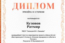 Ученик 4б класса Кузовов Ратмир стал дипломантом 3 степени в викторине " Осенние праздники и события в России" 10.01.2017
