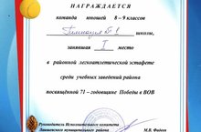 Команда учащихся гимназии приняла участие в легкоатлетической эстафете, приуроченной к 71-ой годовщине Победы. Команда юношей 8-9 классов заняла 1 место. В командном зачете команда гимназии заняла 2 место. 16.05.2016