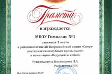 Гимназия заняла 1 место в муниципальном этапе 12 Всероссийской акции "Спорт-альтернатива пагубным привычкам!"