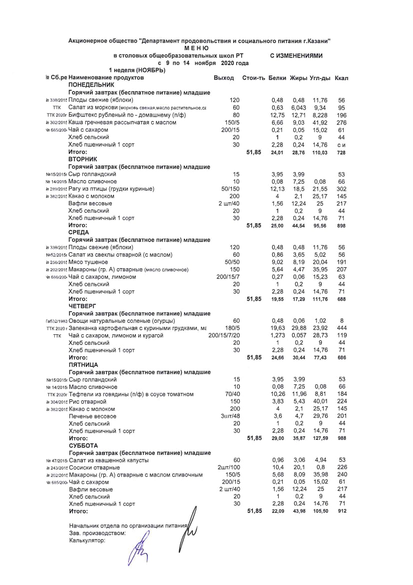 Меню на сентярь. Нечетная неделя. Бесплатное питание для 5-11 классов
