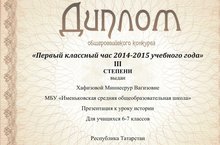 Поздравляем учителя истории Хафизову М. В., победившую в общероссийском конкурсе "Первый классный час 2014-2015 учебного года".