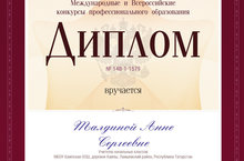 Молодой педагог нашей школы Анна Сергеевна Талдина стала победителем Международного Конкурса « Нравственно-патриотическое воспитание личности» и награждена ДИПЛОМом за I место.