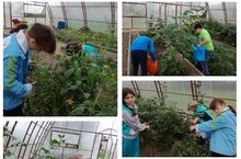 Учащиеся вспомогательных классов школы-интернат на уроках технологии ухаживают за овощами в школьной теплице.