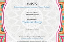 Поздравляем ученика ДШИ г. Лаишево Грабалина Артура (преподаватель Пимурзина Фирдаус Абдулловна) с победой во Всероссийском конкурсе рисунков "Салют Победы". Поздравляем с победой и желаем дальнейших творческих успехов.