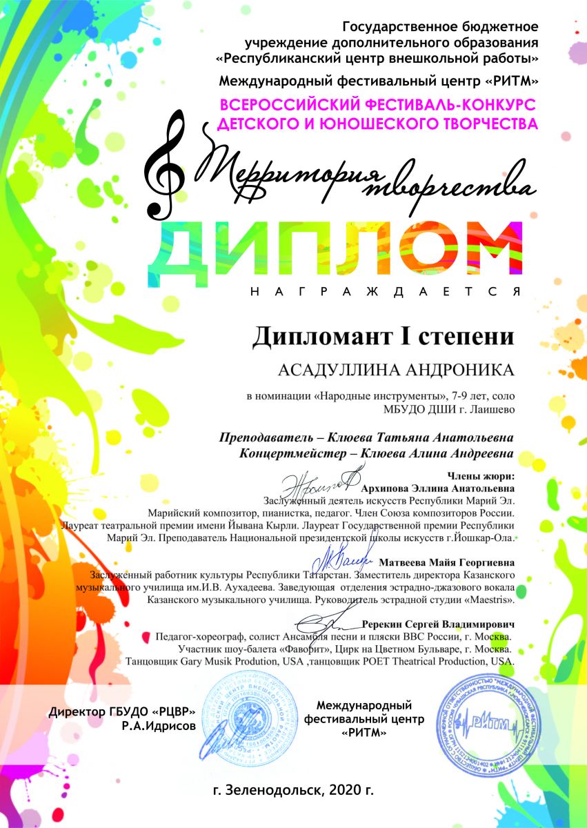 Асадуллина Андроника Дипломант 1 степени "Территория творчества"