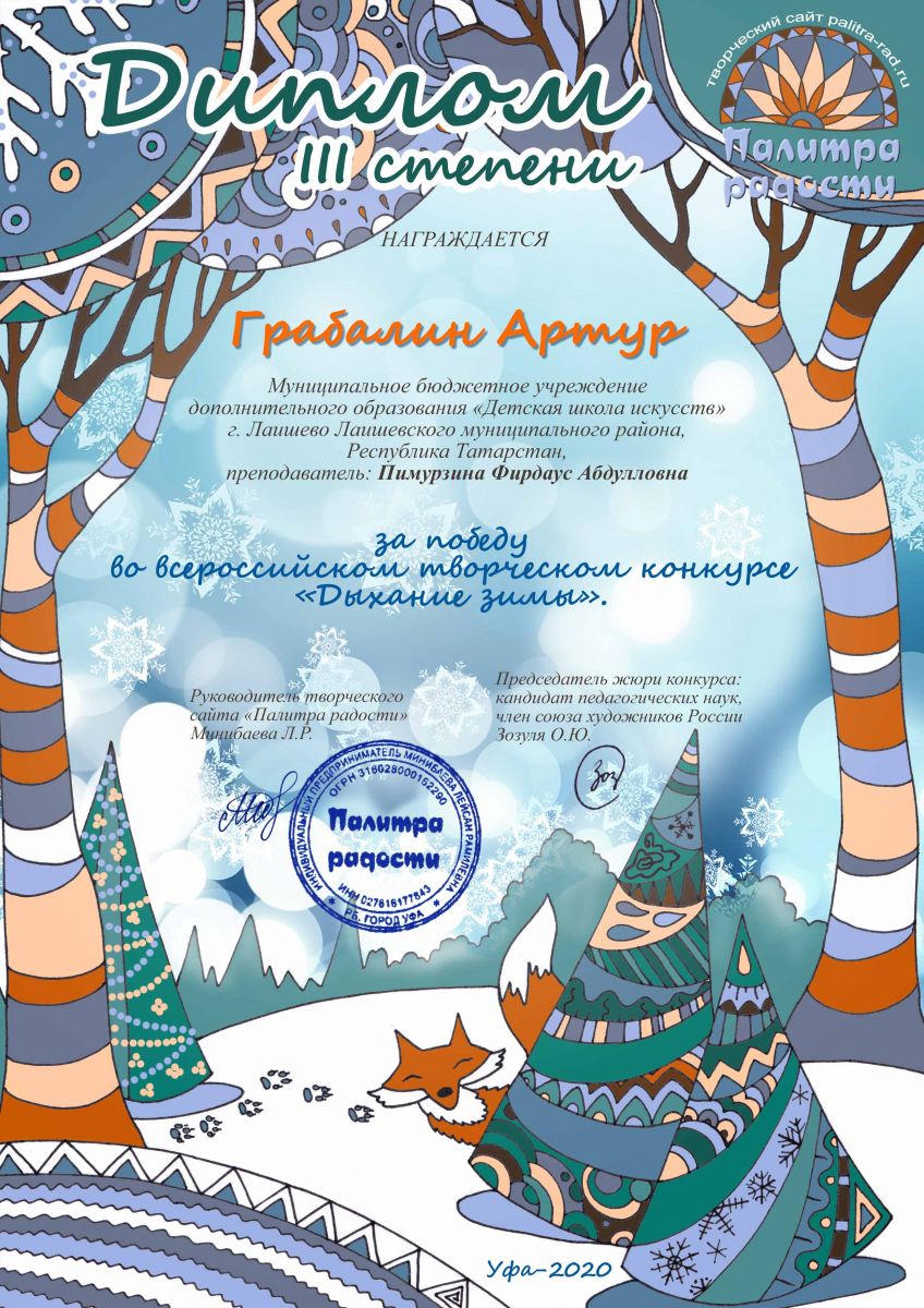Грабалин Артур Диплом 3 степени "Дыхание зимы"