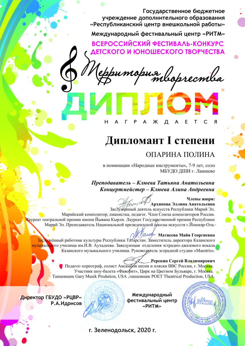 Опарина Полина Дипломант 1 степени "Территория творчества"