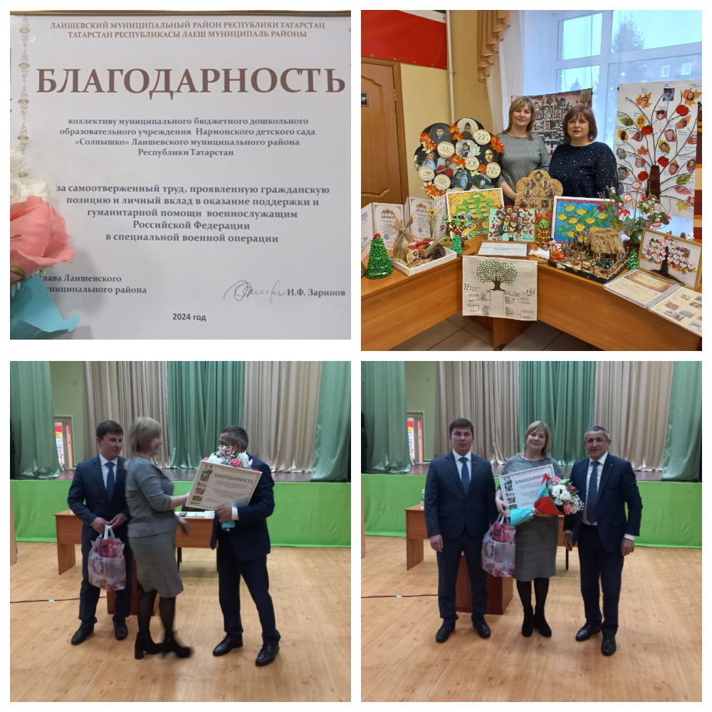 Коллектив МБДОУ Нармонского детского сада "Солнышко" Лаишевского муниципального района РТ был отмечен благодарностью главы Лаишевского муниципального района за самоотверженный труд, проявленную гражданскую позицию и личный вклад в оказании поддержки и гуманитарной помощ военнослужащим Российской Федерации в специальной военной операции.