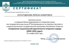 Учитель родного (татарского) языка и литературы Хуснутдинова Лейсан Анваровна приняла участие в создании банка видеоуроков по татарскому языку как государственному языку РТ в рамках реализации государственной программы РТ «Сохранение национальной идентичности татарского народа 2020-2024 годы).