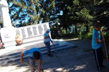 Пришкольный лагерь труда и отдыха "Радуга". Работы в трудовом лагере очень много. Но всё же мы не забываем про памятник павшим воинам в Великой отечественной войне. 14.07.2014