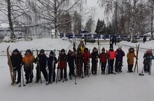 В школе начались уроки физкультуры на вежем воздухе. Ученики с удовольствием катаются на лыжах.