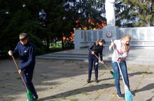 Осенняя неделя добра. 12.09.2015 Отряд волонтеров принял участие в субботнике по уборке территории "Аллеи Славы"