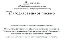 МБОУ "Нармонская СОШ" получила благодарственное письмо за успешные выступления учащихся во Всероссийской олимпиаде по предпринимательству 21.04.2016