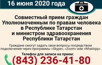 16 июня 2020 года состоится совместный тематический прием граждан Уполномоченным по правам человека в Республике Татарстан и министром здравоохранения Республики Татарстан в режиме видеосвязи.