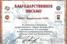 МБОУ "Нармонская СОШ" получила благодарность за содействие в проведении республиканского "Марша Памяти - 2017", посвященного 75-й годовщине Любанской наступательной операции советских войск под Ленинградом. 15.03.2017